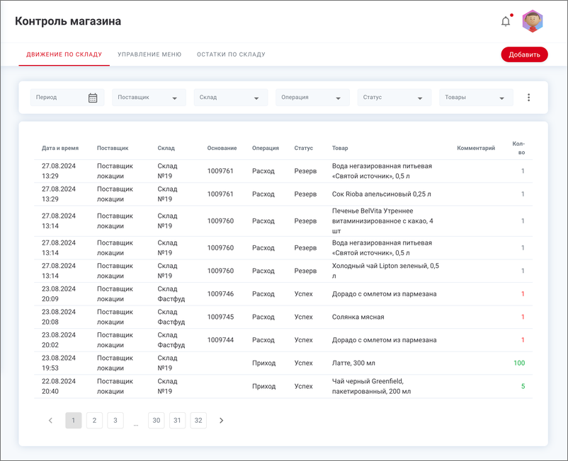 Показать исходный текстИстория страницыСсылки сюдаНаверх Поделиться через Поделиться через... Twitter LinkedIn Facebook Telegram WhatsApp RedditОтправить по эл.почтеПечать × Содержание Движение по складу Добавление движения по складу Фильтр операций Экспорт Это старая версия документа! Движение по складу Для просмотра операций, произведенных с остатком товара, предназначен раздел «Контроль магазина > Движение по складу» в интерфейсе «Управление экосистемой». Примечание. Вкладка «Движение по складу» доступна только в веб-приложении для пользователя с ролью «Менеджер магазина».Как перейти на вкладку «Движение по складу» Для перехода в раздел «Контроль магазина > Движение по складу»: Войдите в веб-приложение Olvery. В боковом меню в переключателе интерфейсов выберите «Управление экосистемой». В результате будет осуществлён переход в интерфейс администрирования. Перейдите в раздел «Контроль магазина» на вкладку «Движение по складу». Операции над остатками товаров, такие как поступление, списание, резерв и отмена резерва представлены в виде списка: Список отсортирован по убыванию даты и времени проведения операции и содержит информацию: Дата и время. Дата и время выполнения операции; Поставщик. Название компании-поставщика; Склад. Склад компании-поставщика; Основание. Возможные варианты: Номер заказа. Номер заказа в приложении Olvery со ссылкой на детализацию заказа. Указывается в случае, если была выполнена автоматическая операция «Расход» с любым статусом: «Успех», «Резерв» или «Отмена»; Пустое значение. Указывается в случае, если была выполнена вручную операция «Приход» или «Расход»; Операция. Операции могут быть выполнены автоматически или вручную: Приход. Операция может быть выполнена только вручную. Операция означает, что было добавлено поступление товара на складе. Статус данной операции может быть только один – «Успех»; Расход. Операция может быть выполнена как вручную, так и автоматически. Операция означает, что было выполнено списание товара на складе. Возможные статусы: «Успех», «Резерв» или «Отмена»; Статус операции. Возможные варианты: Успех. Поступление (приход) или списание (расход) товара было выполнено вручную в интерфейсе изменения остатка товара или был создан заказ типа «Продажа номенклатуры» и взят в работу, т.е. переведен в статус «Активен», «Собран» или «Выполнен»; Резерв. Создан заказ типа «Продажа номенклатуры» и система осуществила резервирование товаров; Отмена. Пользователь не оплатил заказ или отменил его. У Менеджера по услугам также есть возможность отменить заказ, в том числе и уже оплаченный; Товар. Наименование товара из каталога; Комментарий. Комментарий к операции поступления «Приход» или списания «Расход», которые были выполнены вручную в интерфейсе изменения остатков товара; Количество. Количество товара, которое было использовано при совершении операции. Примечание. В списке не отображаются операции по заказам, если в настройках услуги с типом «Продажа номенклатуры» установлен флажок в поле «Не учитывать остатки». Добавление движения по складу Фильтр операций Фильтрация операций в списке доступна по следующим параметрам: Период. Выберите дату начала и окончания периода с помощью раскрывающегося календаря; Операция. Возможные варианты: Приход; Расход; Статус. Множественная отметка. Возможные вар